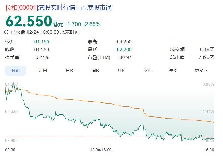 24日,长和股价跳水,截至收盘跌2.65%报62.55港元/股,总市值2396亿港元。