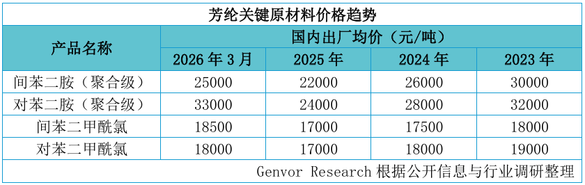 根据Genvor Research基于公开信息与行业调研整理的最新数据,2023-2026年国内芳纶四大核心原材料的价格波动,已经清晰展现了本轮成本上涨的冲击力度: