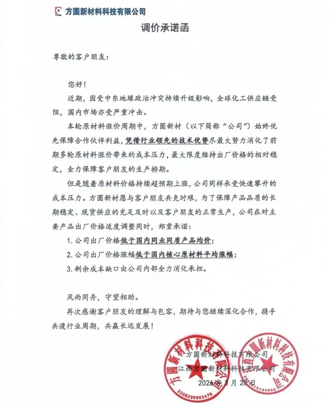 ▲方圆新材调价承诺函(图源:方圆新材)