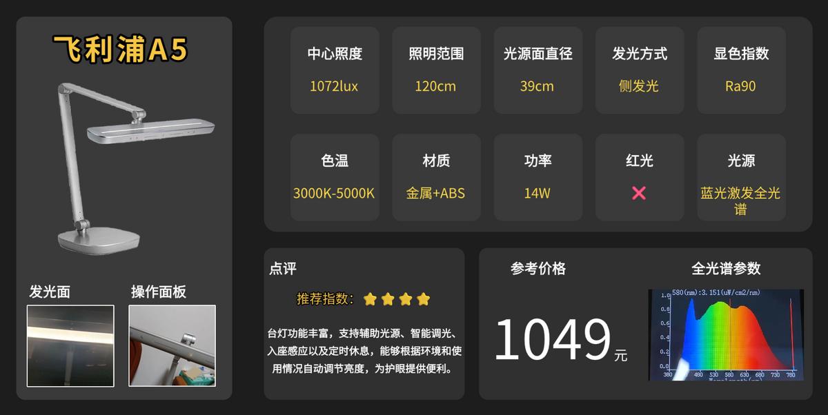 护眼上它采用的是蓝光激发全光谱技术,430nm左右的蓝光峰值尖锐且强度较高,接近1.0,这个波段属于高能短波蓝光区域,长期使用可能增加视网膜疲劳的概率,不是很符合理想护眼灯的蓝光控制标准。