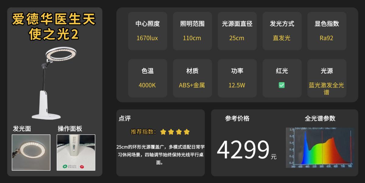 护眼台灯品牌排行前十名有哪些牌子?爱德华医生天使之光2主打实用照明,核心采用25cm环形双光源搭配直发光设计,既能有效扩大照明面积至120cm,又能通过环形补光中和直发光的生硬感,一定程度上减少眩光、缩小书写阴影区域,让读写视野更开阔。它的中心照度达1670lux,符合国AA级标准,光线集中明亮,完全能满足日常阅读、书写与创作需求。