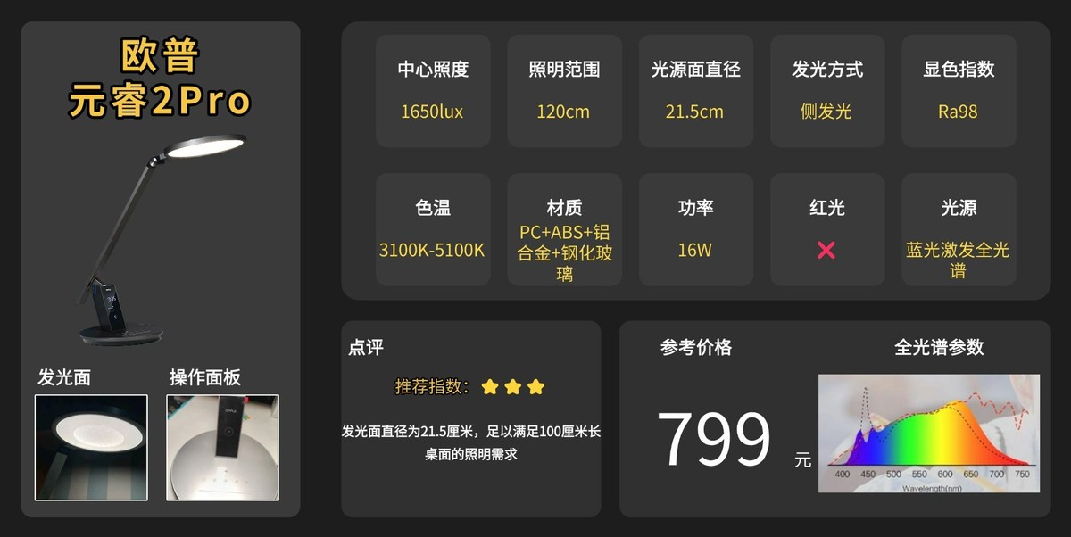 护眼台灯品牌排行前十名有哪些牌子?欧普元睿2Pro在实用性和交互设计上下了不少功夫,灯臂设计有4个可调节关节,角度调节很灵活,能适应不同的坐姿和桌面布局。它的照明表现中规中矩。采用了侧发光技术,配合三重控光设计,光线还算柔和,能覆盖到120cm的桌面范围,中心照度也够用。显色指数能达到Ra98.6,色彩还原度很高,看书本或看图时颜色很正。