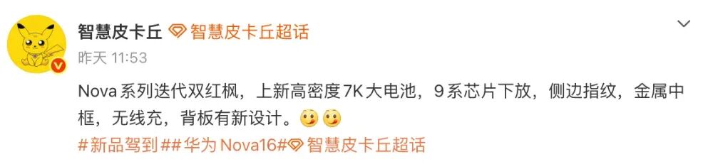 除了即将发布的新机外,博主@智慧皮卡丘 近日的一份消息中显示,“Nova系列迭代双红枫,上新高密度7K大电池,9系芯片下放,侧边指纹,金属中框,无线充,背板有新设计。”