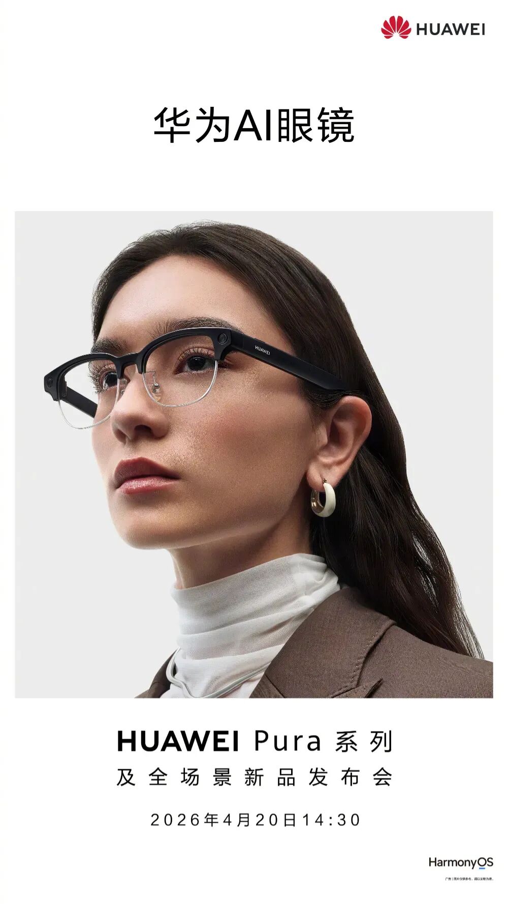 今天的最新预热中还显示,华为AI眼镜也将在4月20日的华为Pura系列及全场景新品发布会上亮相。