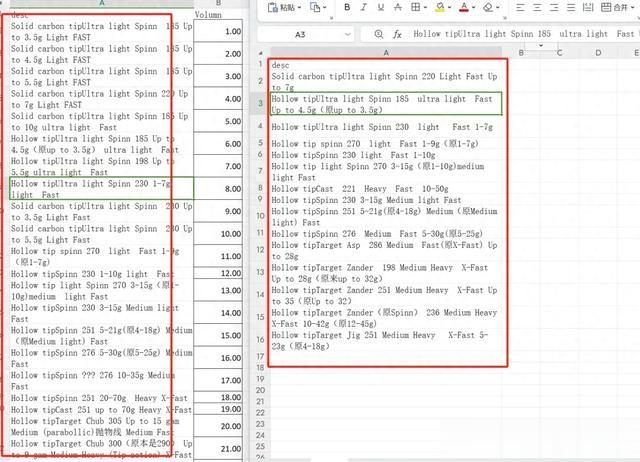 1.小李的挑战近期,小李就遇到了这样一个挑战:需要匹配两个Excel表中的数据,但这些数据是多个人经手的,格式和准确性存在较大的差异。具体来说,匹配列的数据非常相近却又不同,比如同一数据在一个表里是“Solid carbon tipUltra light Spinn 195 Up to 35g Light FAST”,在另一个表里就变成了“Ultra light Spinn Solid carbon tip 195 Up to 35g FASTLight”。也就是数据的基本元素是相同的,只不过是字符顺序、大小写、空格不尽相同,面对这样的问题,传统的Vlookup方法显然无法满足需求。