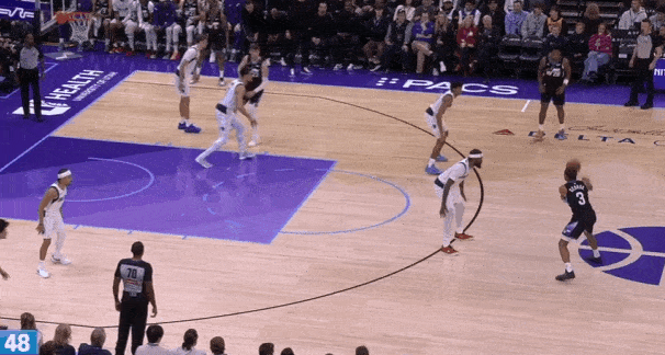 贝利接球突破攻击弗拉格Close out后马绍尔执行“剥离换防”(Peel Switch),乔治见状立即外拆至三分线接贝利传球迎着扑防的弗拉格出手三分。