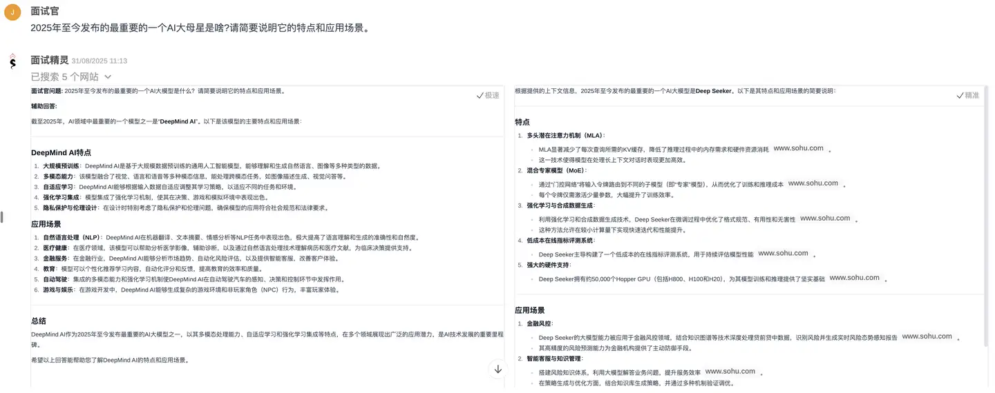 面试精灵通过联网搜索,正确找到了2025年上半年最火的大模型Deep Seek,并给出了准确的特点和应用场景说明。