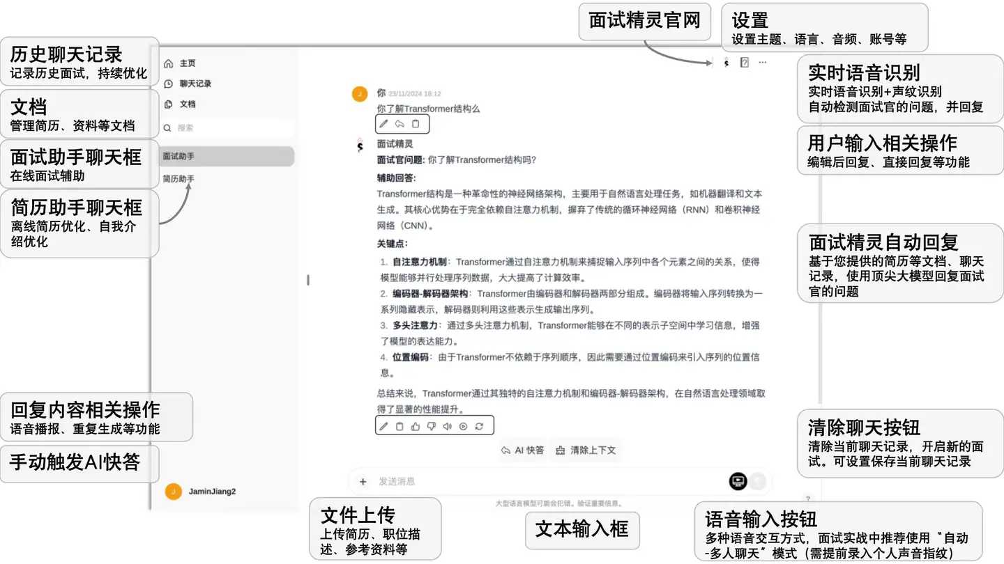 面试精灵结合声纹识别和大语言模型,能够自动区分面试官和求职者的语音内容。在跨设备使用场景下,一台设备可识别面试官问题并自动回复,隐蔽性更强。