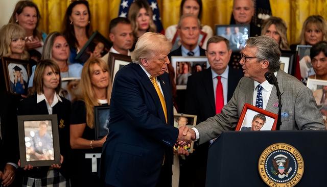 2025年7月16日,美国总统特朗普在白宫签署《全面遏制芬太尼贩运法案》。在镜头前,他举起一张14岁男孩的遗像。