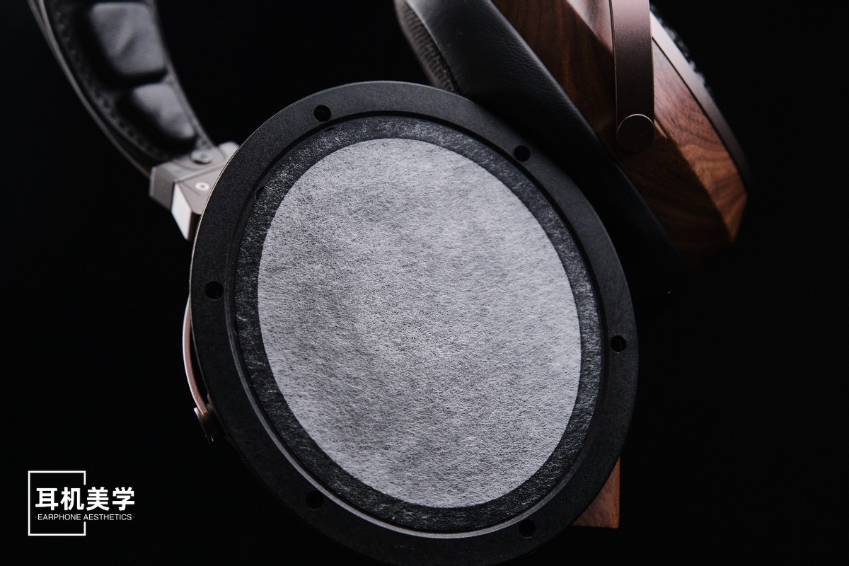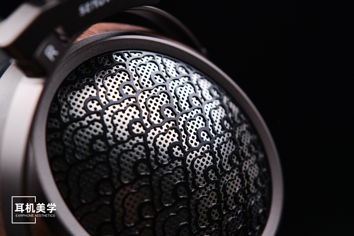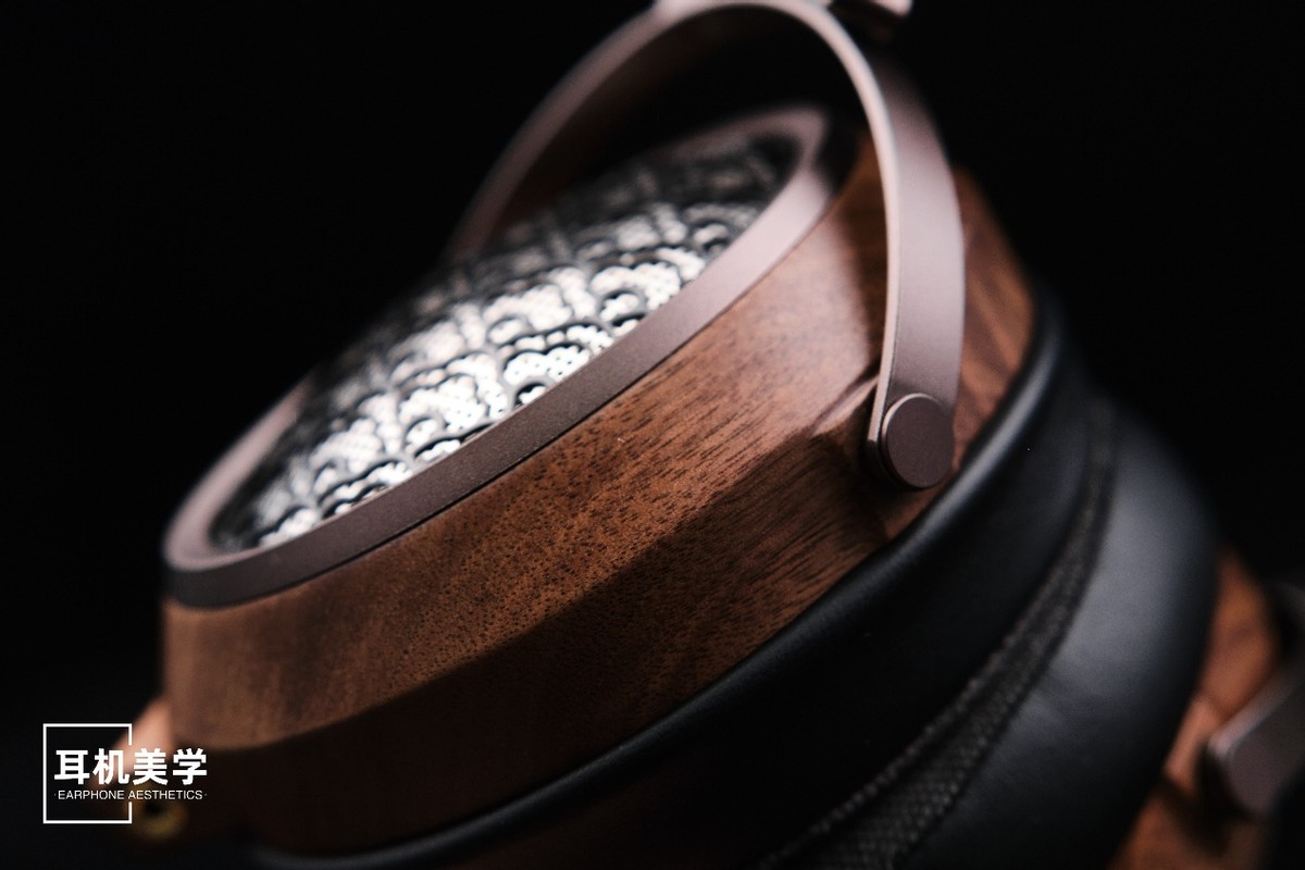 单从外观与设计工艺上,这种旗舰级的取向就已经被清晰地表达出来。白鹭的外观相当典雅,大尺寸耳罩配合木质腔体,让整副耳机在比例上显得舒展而从容,带给人稳定与完整的整体印象。高密度黑胡桃木外壳纹理清晰,自然木纹在不同光线下呈现出层次变化,经过反复打磨与表面处理之后,既保留了木材本身的温润感,又显得克制而成熟。这种观感并不是为了第一眼的惊艳,而是那种越看越耐看的类型。耳罩外侧的网罩纹样同样体现了这种取向。纹理细密、有序但并不浮夸。金属支架与连接结构采用低调的枪色氧化处理,存在感被刻意压低,却在细节处体现出良好的加工精度。整体外观给人的感觉更接近一件成熟的艺术品,而非刻意强调科技感或视觉冲击的消费电子产品。