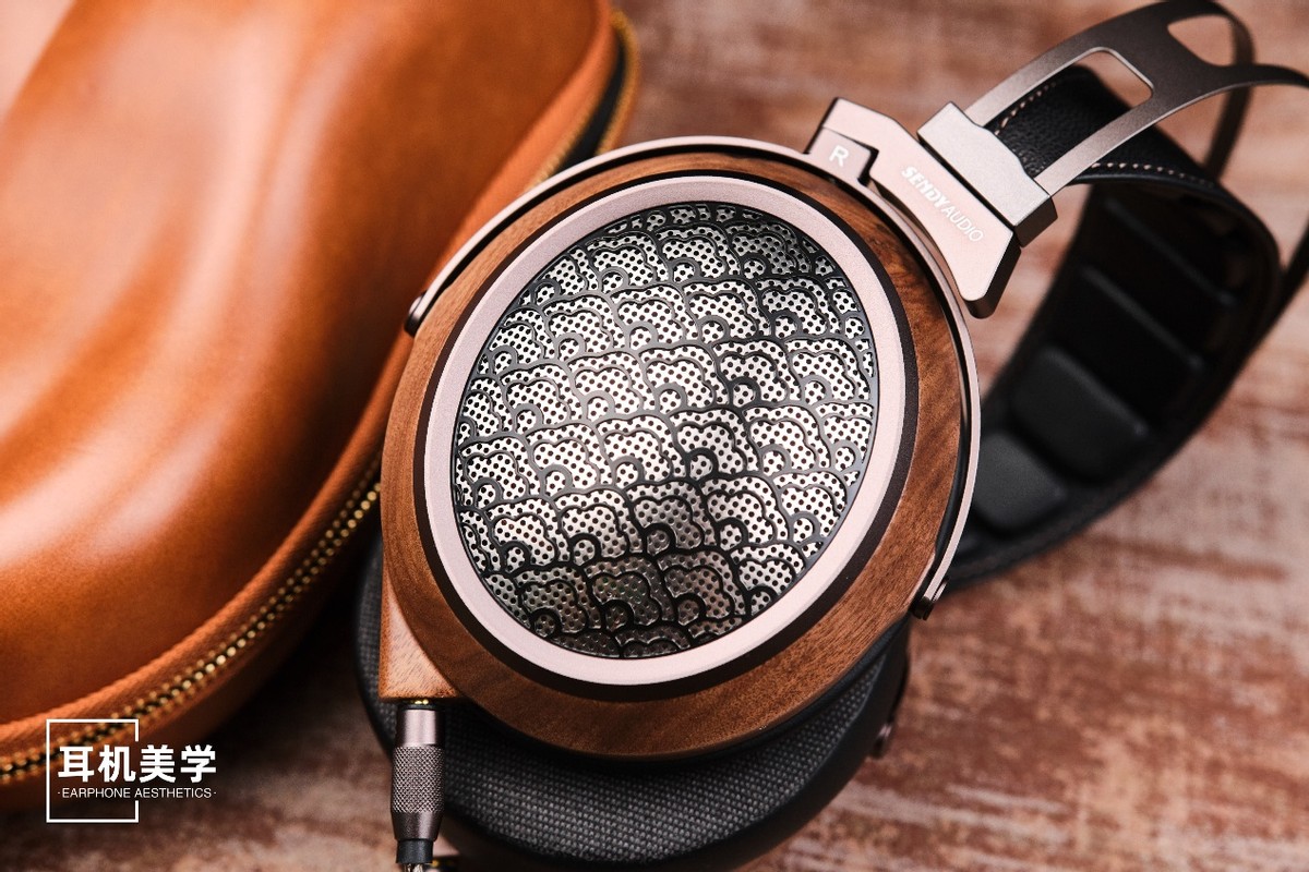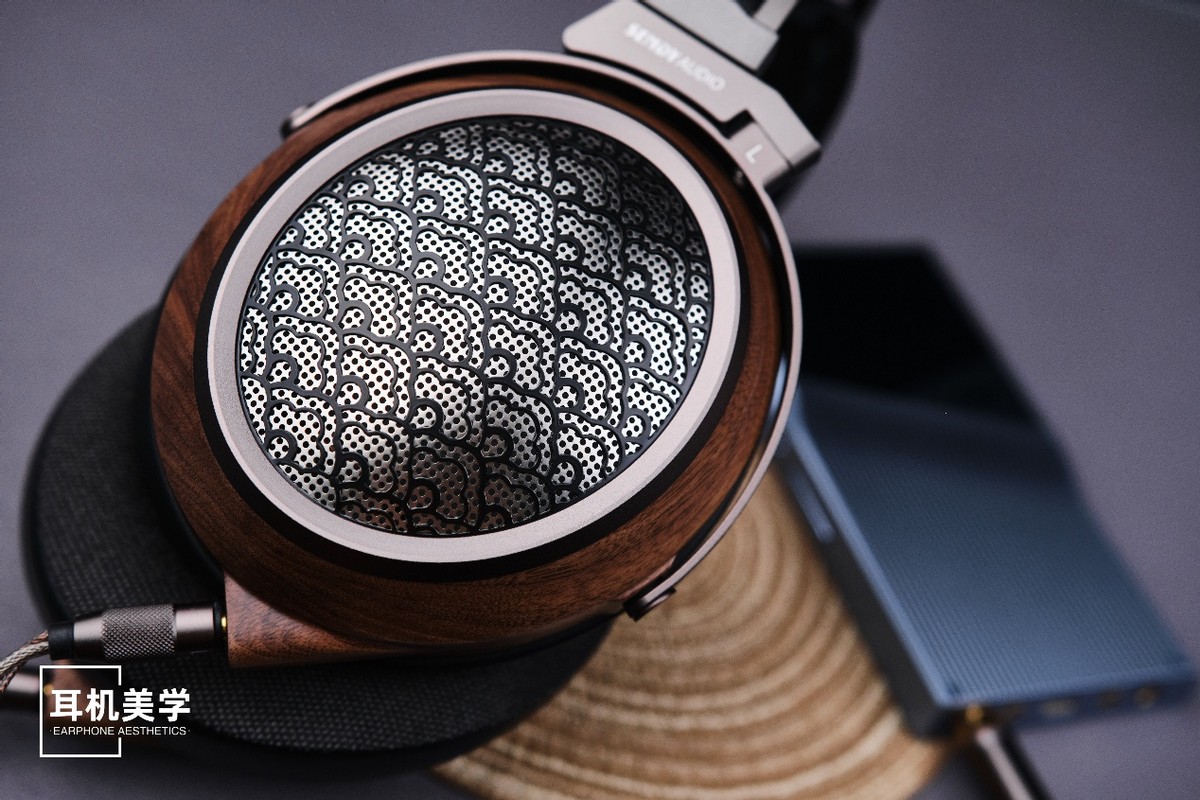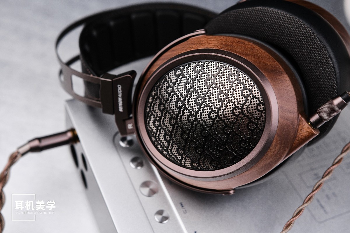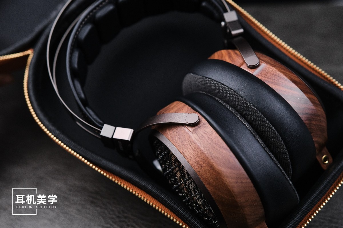 单从外观与设计工艺上,这种旗舰级的取向就已经被清晰地表达出来。白鹭的外观相当典雅,大尺寸耳罩配合木质腔体,让整副耳机在比例上显得舒展而从容,带给人稳定与完整的整体印象。高密度黑胡桃木外壳纹理清晰,自然木纹在不同光线下呈现出层次变化,经过反复打磨与表面处理之后,既保留了木材本身的温润感,又显得克制而成熟。这种观感并不是为了第一眼的惊艳,而是那种越看越耐看的类型。耳罩外侧的网罩纹样同样体现了这种取向。纹理细密、有序但并不浮夸。金属支架与连接结构采用低调的枪色氧化处理,存在感被刻意压低,却在细节处体现出良好的加工精度。整体外观给人的感觉更接近一件成熟的艺术品,而非刻意强调科技感或视觉冲击的消费电子产品。