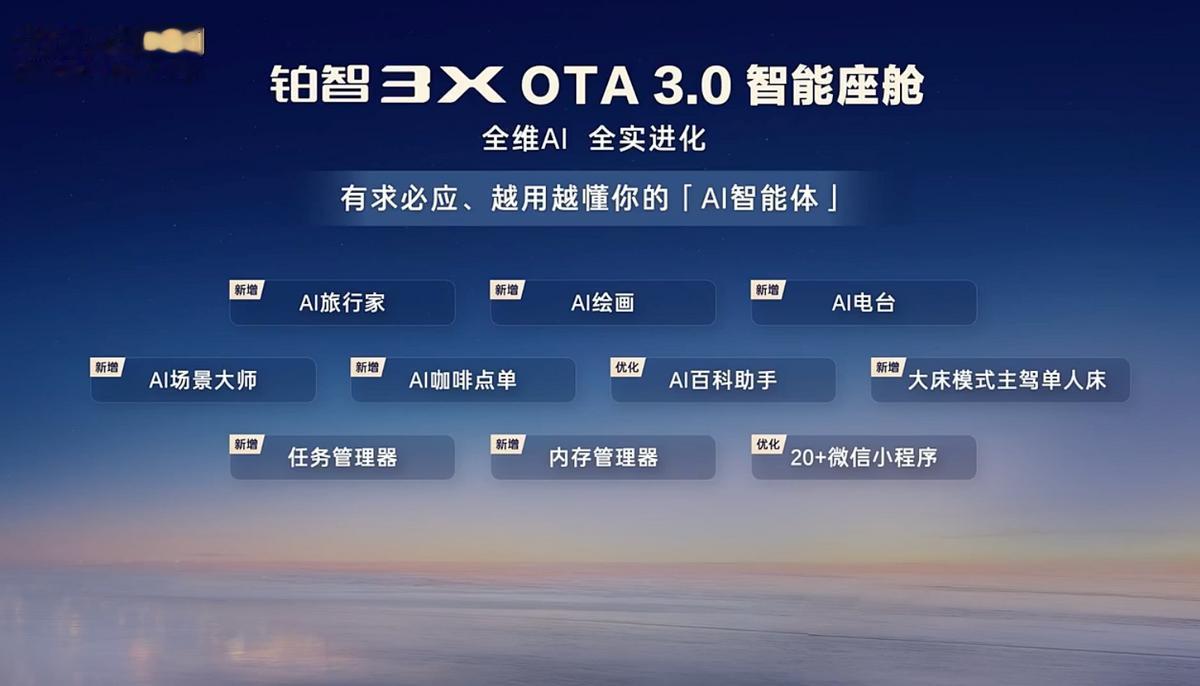 铂智3X OTA 3.0智能座舱,升级AI智能体,新增AI旅行家、AI绘画、AI电台、AI场景大师、AI咖啡点单、大床模式主驾单人床、任务管理器、内存管理器,同时优化AI百科助手、20+微信小程序。