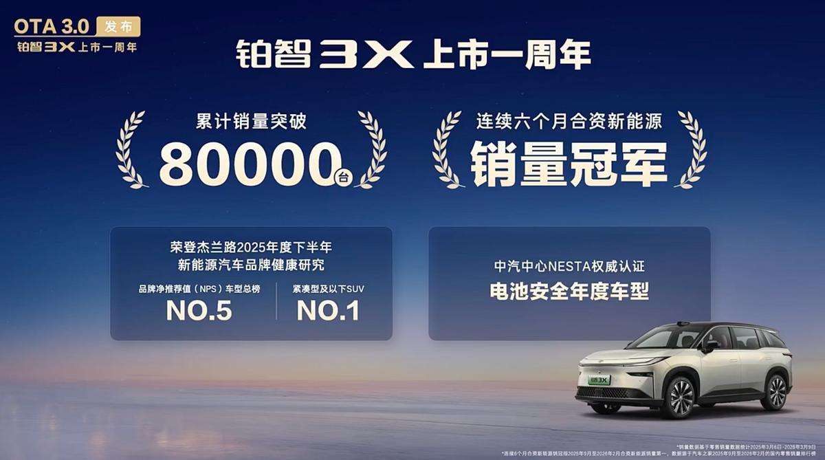 合资纯电SUV中,铂智3X表现十分亮眼,截止目前已经交付超8万辆,且连续6个月拿下合资新能源销量冠军。