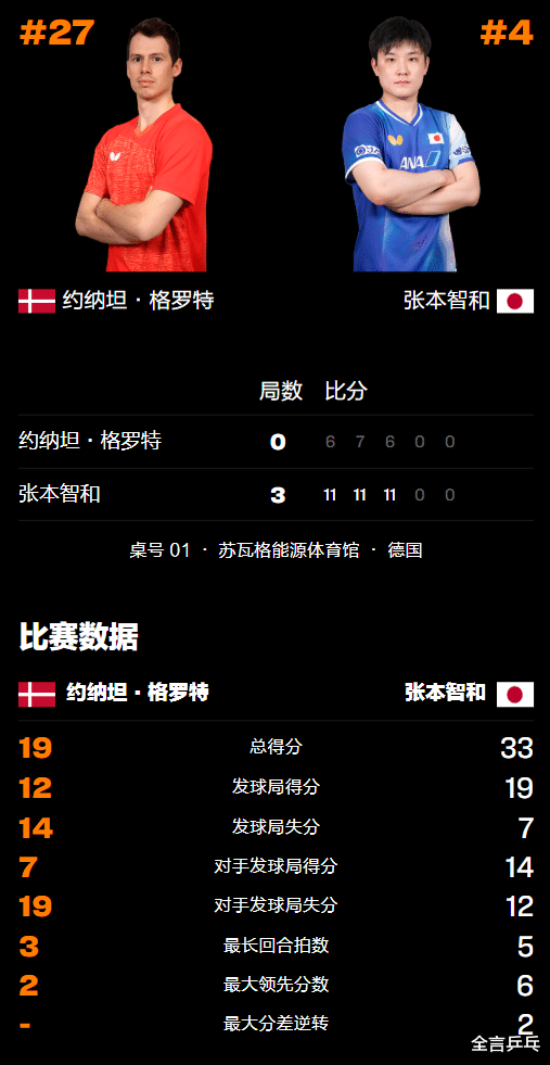 在此之前,两位运动员曾经有过4次交手,张本智和3次零封格罗特,1次与对方战平(世界杯特殊赛制),所以普遍认为此战还是日本主力相对更有优势。