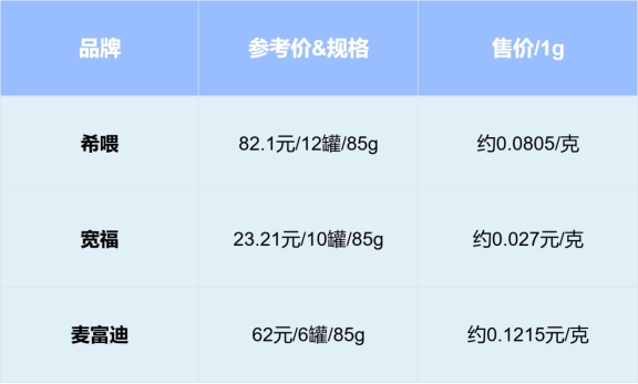 对比项3:性价比对比性价比不是看单罐价格,是看钱花得值不值。低价罐可能有隐性成本,比如说喂了品质安全没保障的罐头,猫咪生病看病要花钱,后期养身体补营养也是一笔开支。贵的罐头呢长期喂养经济压力又比较大。所以真正性价比高的猫罐头应该是在铲屎官预算之内,安全有保障、营养全面均衡、猫咪也爱吃的罐头。
