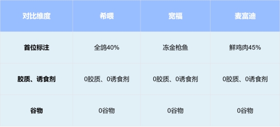 对比项1:原料对比很多新手踩坑都是因为只看宣传看销量,自己没仔细研究下配料表,导致买回来的罐头品质都不太好。包装上画着大块鲜肉,号称高肉含量,翻过来一看,配料表第一位是水,第二位是谷物,肉含量全靠肉类及其制品这种模糊词撑场面。等猫吃出问题了再回头看,罐头里指不定用的是烂肉,加了一堆动物边角料都说不准。我们要对比的是:配料表第一位是不是清晰的肉,占比有没有标出来,有没有添加谷物、胶质物、诱食剂这些吃了没什么营养,还给肠胃增添负担的物质成分。