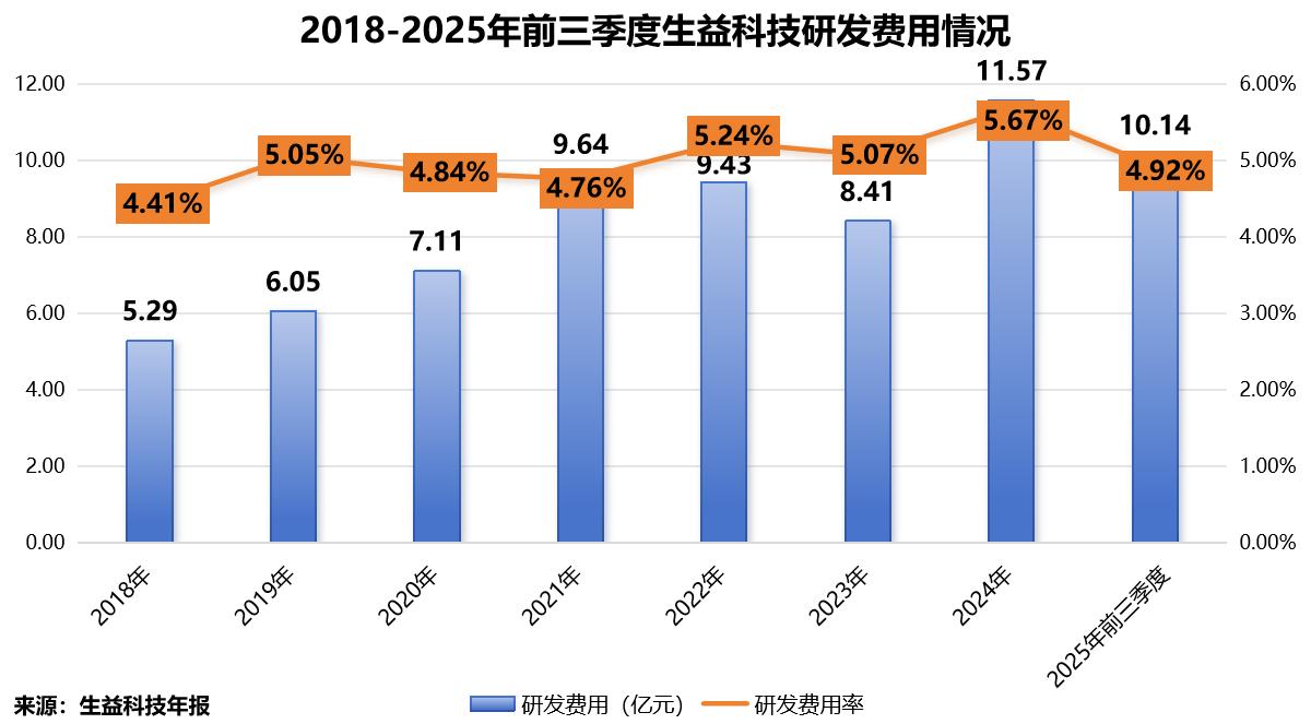 此后,生益科技不断加码研发投入。2018-2025年前三季度,公司累计研发费用高达67.64亿元,且全部费用化,研发费用率也维持在5%左右的高位。