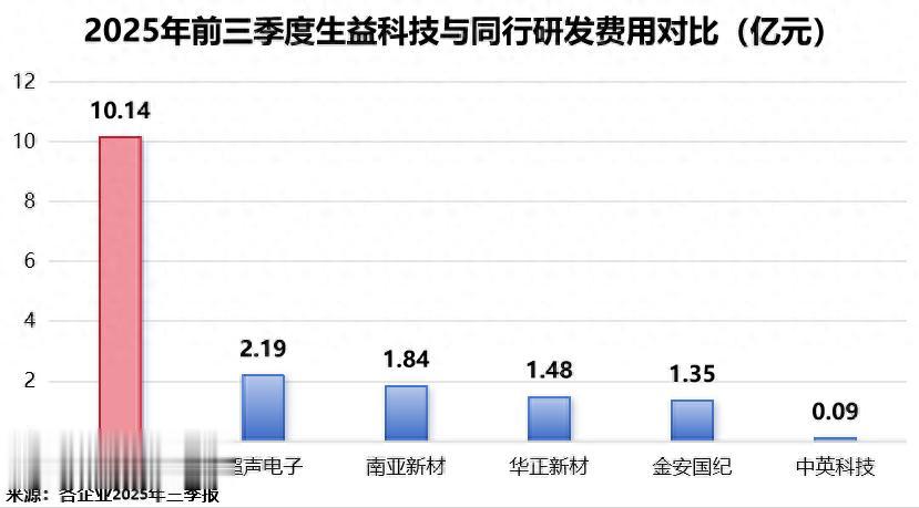 2025年前三季度,生益科技的研发费用高达10.14亿元,同比增幅达28%。这一金额不仅远超超声电子、南亚新材等五家同行,更显著高于五家同行的研发费用之和(6.94亿元)。