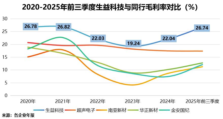 2020-2024年,生益科技的毛利率基本维持在20%以上,远超超声电子、南亚新材、华正新材、金安国纪等同行;且在2025年前三季度恢复至26.74%。