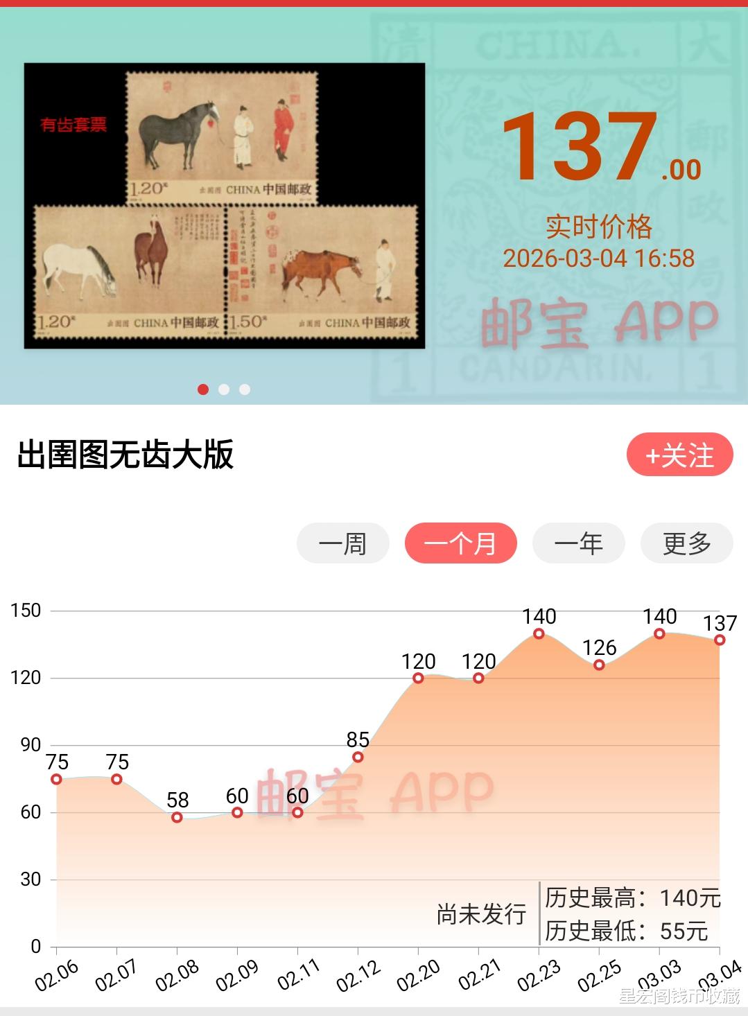 《出圉图》无齿套票,目前市场行情基本上在30~65元左右一套,《出圉图》无齿大版,目前最新市场行情也已经来到了125~190元左右,平均成交价格在125~140元左右。整体上涨幅度也是非常的大,而且最近一段时间《出圉图》无齿大版市场活跃度也是非常高,成交量比较活跃。