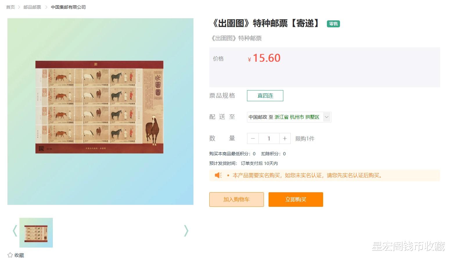 《出圉图》有齿特种邮票在我印象当中销售的比较长的一段时间,到今天还能继续抢购。看了一下,可能跟邮寄有很大的关系,不能自提,如果要是能自提,可能抢购人会多一点,毕竟算上快递费,其实并不是太划算,因为快递费的区间基本上在10~15元左右,按照地区的距离,快递费也会有一些不同。