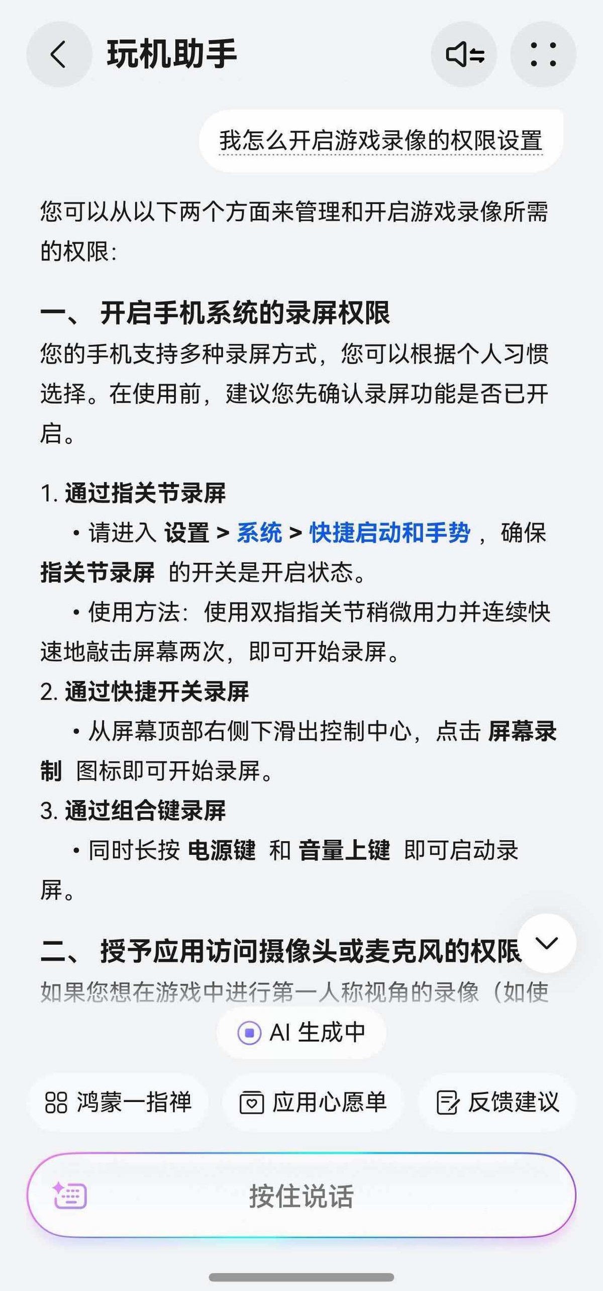 有一次,我想开启游戏录像功能,自己在设置里捣鼓了半天也没弄明白,后来问“玩机助手”很快就给到了准确的解答。玩机助手不仅提供了详细的操作路径,点击蓝字还能直接跳转到对应的设置页面,太贴心了。