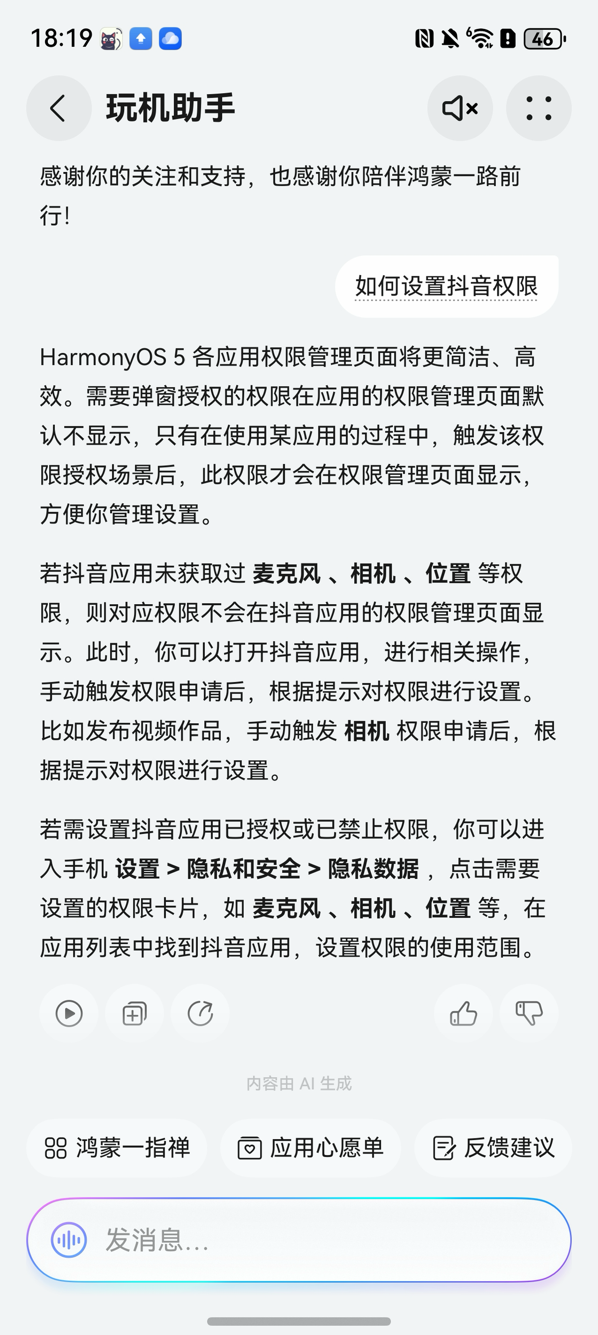 比如提问“如何开启抖音权限”,就能获得清晰明了的解答,跟着步骤操作即可完成权限管理,比上网查找攻略靠谱多了。