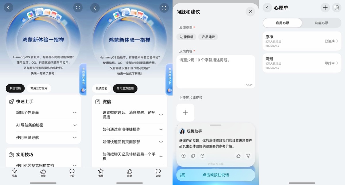 而“反馈建议”和“应用心愿单”这两个通道,则让我这个老用户也能参与到系统的进化中。我曾提交过几次有关系统细节上的改进建议,在后来的更新中看到了相应优化,非常有参与感!如果你发现某个应用的鸿蒙版没上线,还可以在“应用心愿单”添加——我之前许愿过的原神,后来果然上架了。