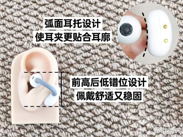 佩戴方面:对比市面上其他耳夹耳机,虹觅Clip Pro在佩戴体验上确实很用心,舒适度和稳固性都很出色。单耳仅4.5g,长时间戴也不会明显压耳;还专门设计了12°弧面耳托,电池区域能贴合耳背,舒适度进一步提升;再加上2.5mm错位结构,戴上自然前高后低,更贴合耳型,日常活动也不容易掉落。
