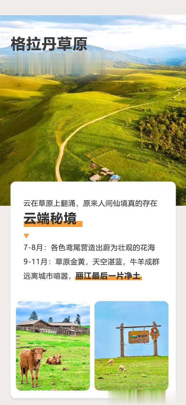 早餐后离开虎跳峡镇,乘车前往丽江老君山国家地质公园腹地,有一片高山草甸,被称为飘在云朵上的草原【格拉丹草原】。它不同于人们熟知的大草原,也有别于一般的高山草甸,它有着属于自己别具一格的美。格拉丹草原被称为“丽江的空中牧场”,夏季绿毯铺地,牛羊成群;