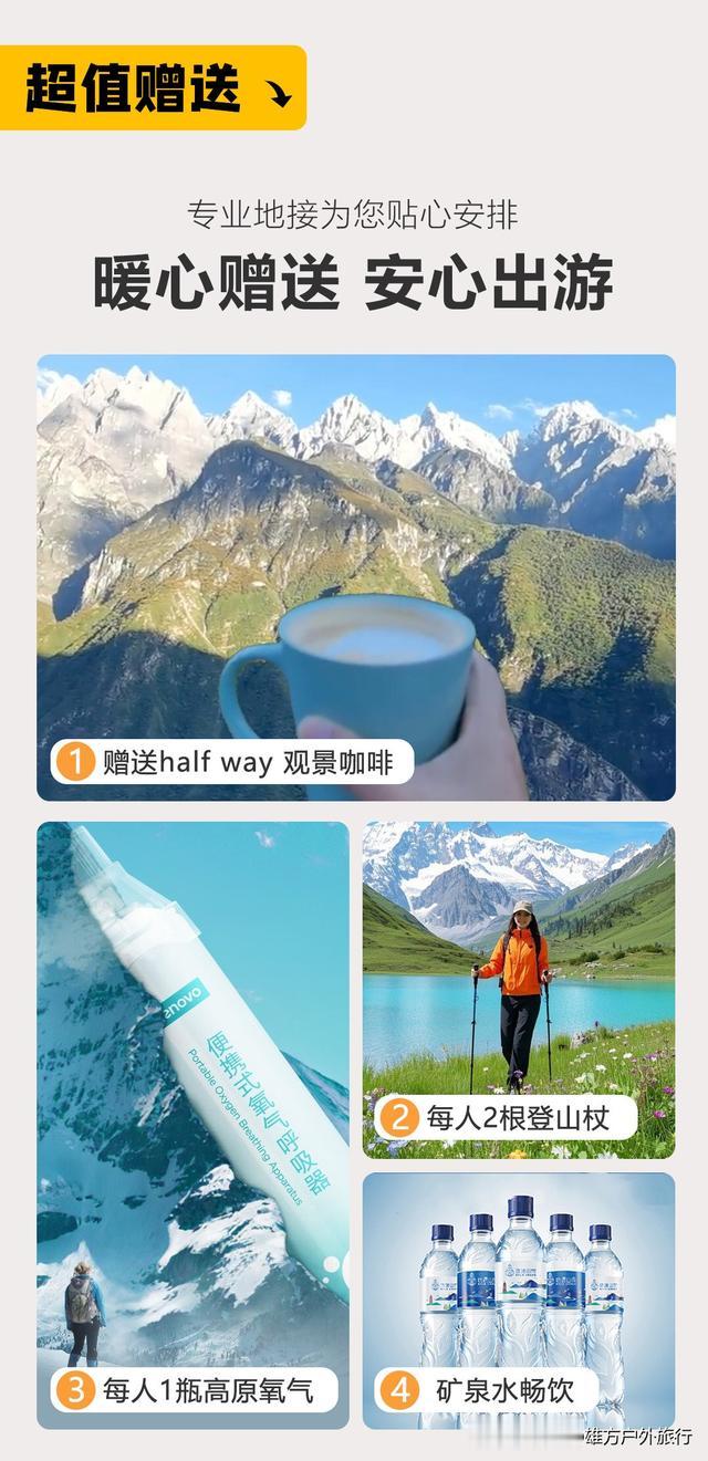 【超值赠送】赠送虎跳峡Half way 观景咖啡;每人1瓶便捷式高原氧气;每人2根登山杖提供行程内使用;每人每天充足矿泉水。