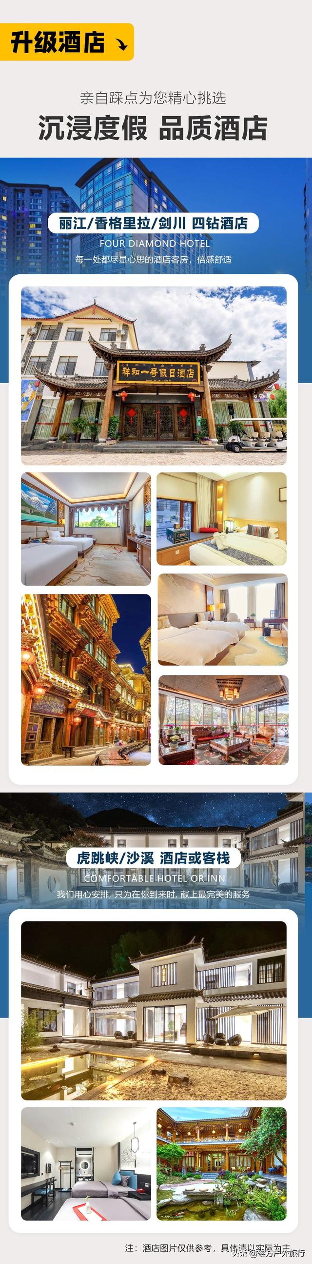 3、住宿:全程5晚住宿{3晚4钻酒店+2晚舒适型酒店(丽江四钻酒店、香格里拉四钻酒店、虎跳峡舒适酒店、剑川四钻酒店、沙溪古镇客栈或民宿)}