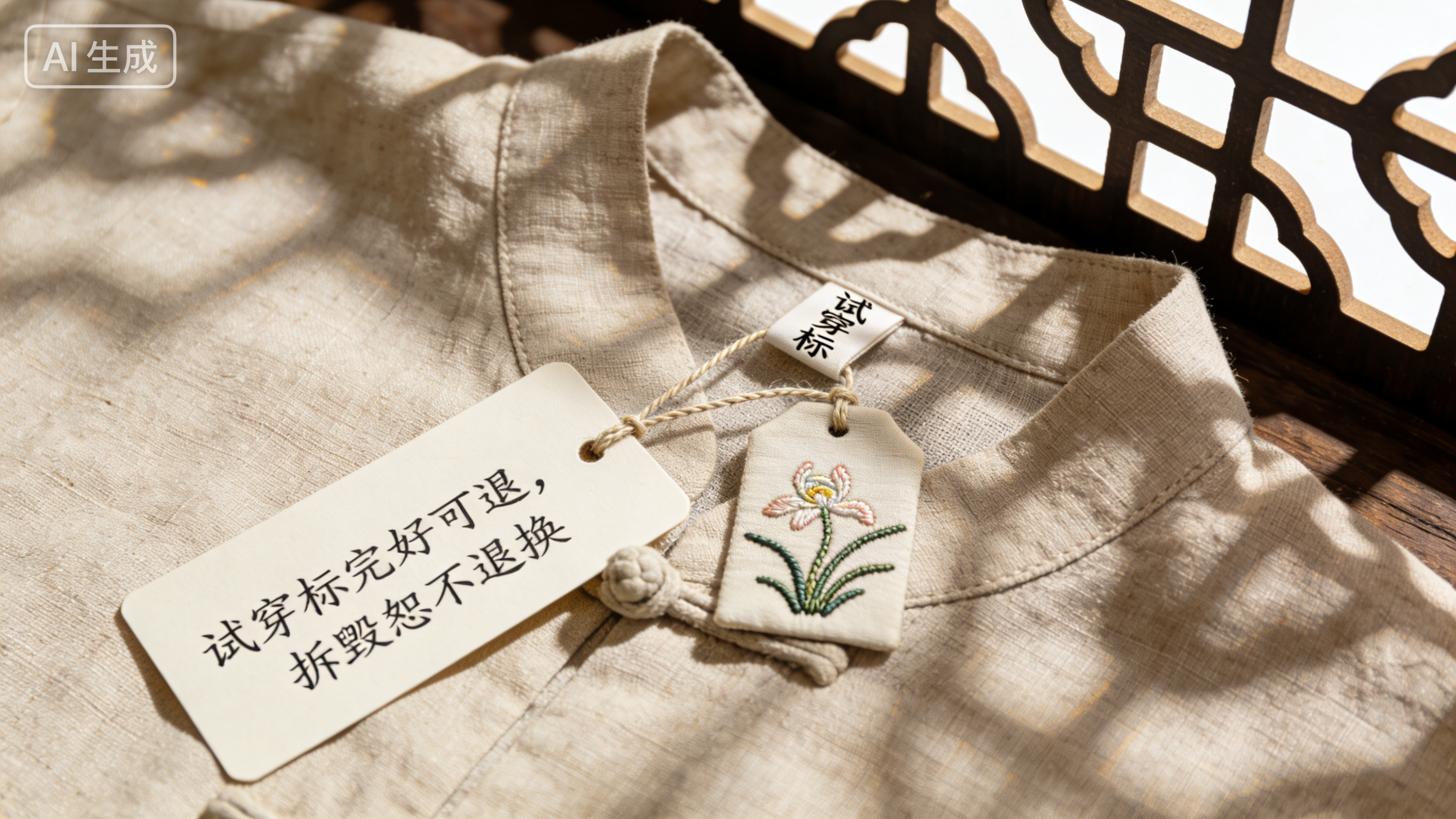 这些 “试穿标” 可不是普通的标签,而是印着中式花纹(比如小兰花、祥云)的特殊标签,贴在衣服的吊牌旁边,上面写着 “试穿标未拆可退,拆毁不退”!
