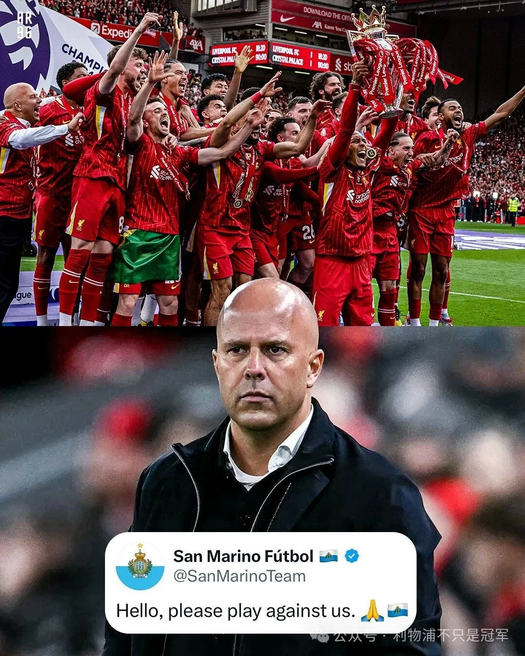 斯洛特还成为大家开涮的目标。连欧洲鱼腩圣马力诺的官方账号都开玩笑说:“我们也想跟利物浦踢一场!”