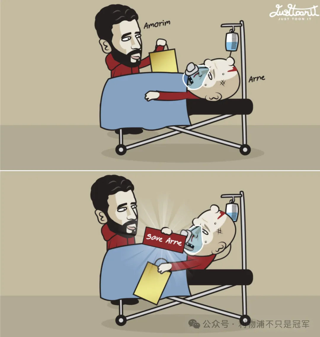 而死敌曼联主帅阿莫林则在斯洛特病入膏肓之际“雪中送炭”,斯洛特打开礼物袋,里边的标语写着:保卫斯洛特!