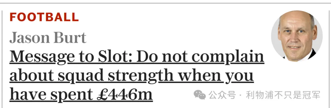 《每日电讯报》致斯洛特:“花了4.5亿,你就别抱怨阵容深度不足了!这样做只能给你自己找麻烦。”文章开头就举了2012年切尔西主帅博阿斯的例子,当时他抱怨切尔西的阵容没法和曼城相比,下一场比赛之后博阿斯下课了。