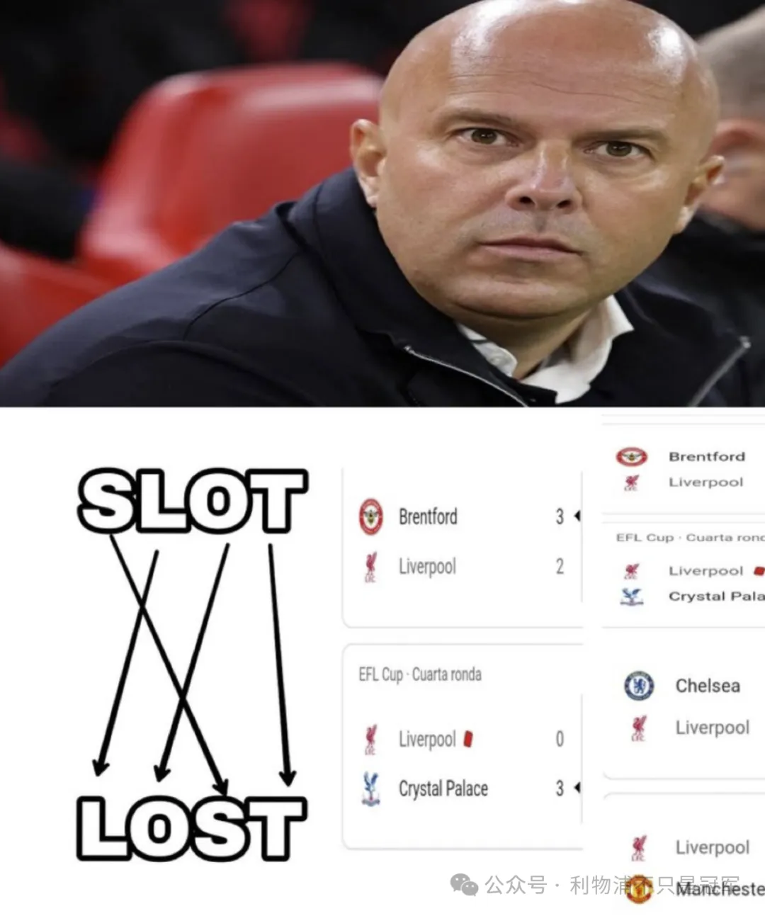 更有甚至,斯洛特的英文名字SLOT,四个字母稍微换个位置,就变成了LOST(失败)。真是墙倒众人推。