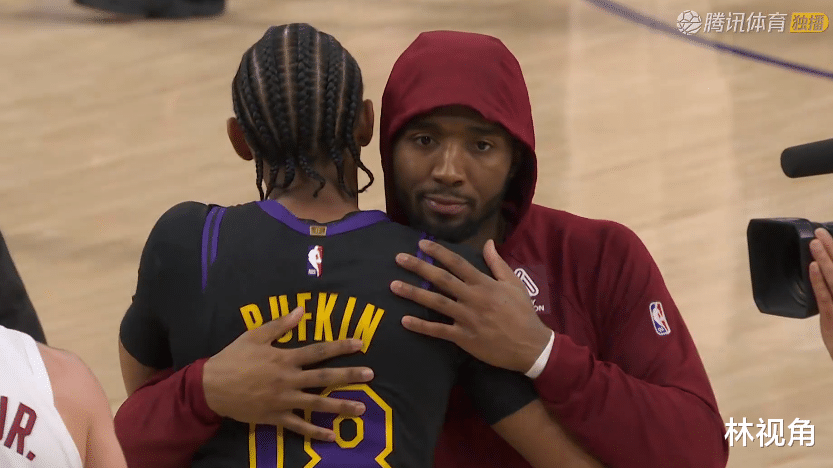 米切尔很友好,走向湖人替补席方向,一把抱住走过来的东契奇,与其亲切拥抱致意,然后又和湖人其他球员逐一拥抱致意,看起来心情不错。