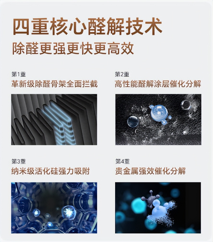 二、除醛黑科技:四重分解,告别反弹陷阱新装修家庭最担心“甲醛反弹”,传统活性炭滤网3个月就易饱和,而新颐A8的四重醛解技术彻底解决这个痛点:通过除醛骨架拦截、催化涂层裂解、纳米活化硅吸附、贵金属分解,将甲醛转化为水和CO₂,从“吸附暂存”升级为“永久歼灭”。
