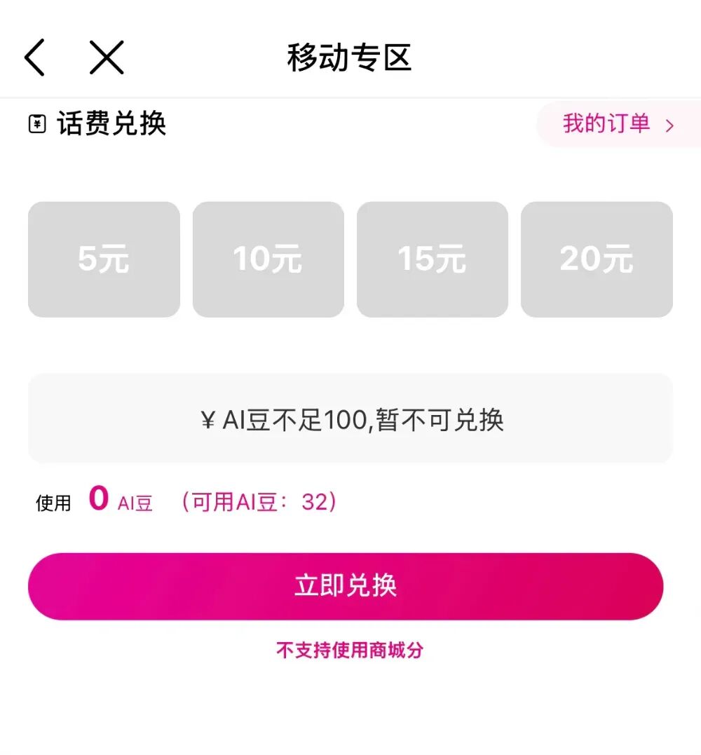 不想发送短信的小伙伴可以直接在中国移动APP搜索“AI豆兑换”,随后继续搜索“话费兑换”,即可进入兑换页面。