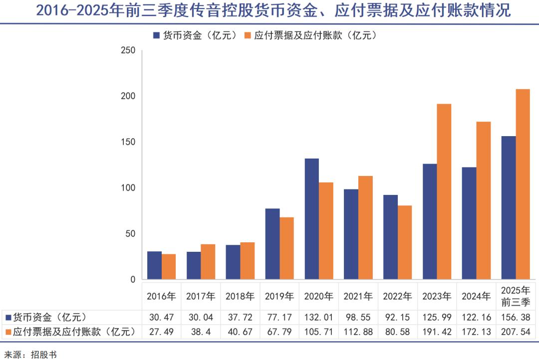 根据2025年三季报数据,其应付票据和应付账款从2024年的172.13亿元涨到了207.54亿元,增幅显著。这已经是传音控股近三年时间内,账面货币资金持续远小于应付票据及应付账款数字,这意味着传音控股对上游供应商的付款压力加大,且供应链的稳定性可能受到影响。