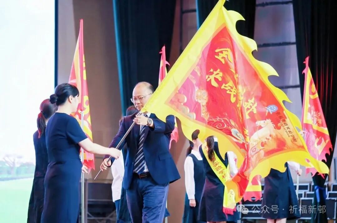 授旗仪式上,各班代表昂首挺胸接过鲜红班旗,鲜艳的旗帜迎风飘扬,承载着每个班级的中考梦想,凝聚着全体学子的冲刺力量。