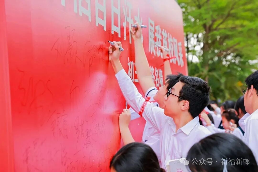 红色签名板上,师生们郑重签下姓名,一笔一划皆是对梦想的承诺、对未来的期许,既定格了祈福英校初三学子的热血与荣光,也镌刻下全体师生同心同行、共赴中考的坚定信念。