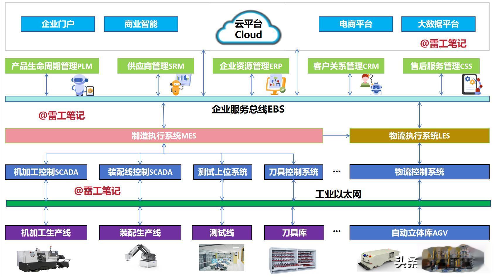 顶层(计划层):ERP系统,负责战略规划(生产计划、物料需求)。
