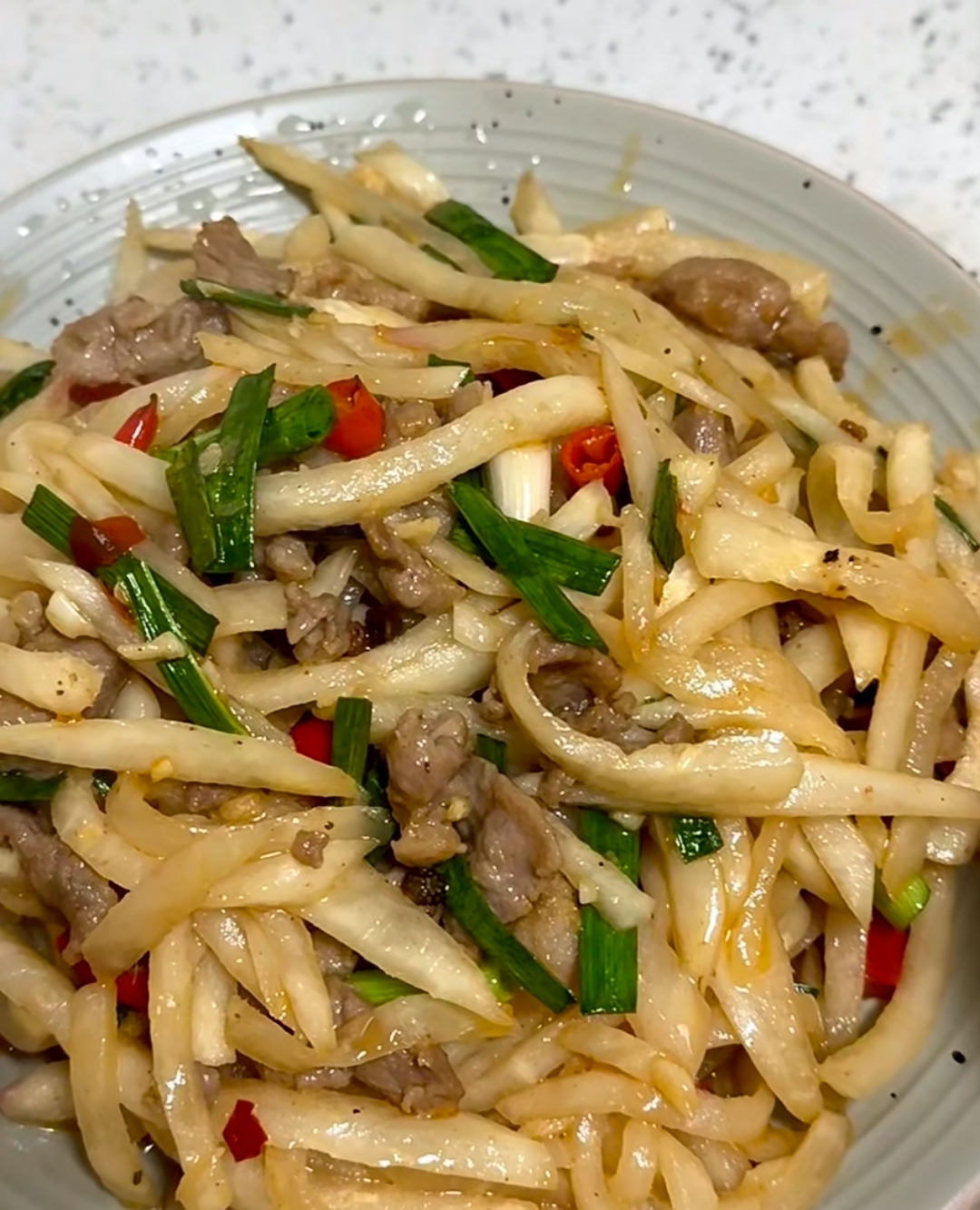 待萝卜丝断生变软,淋入一勺生抽提鲜,加少许蚝油增味,快速颠勺让每一根丝都均匀上色。最后关火的瞬间,撒入一把翠绿鲜亮的蒜苗段和一点点味精,利用余温将蒜苗的独特辛香激发出来,与锅中的红亮色泽交相辉映,出锅装盘便是一道绝美的佳肴。
