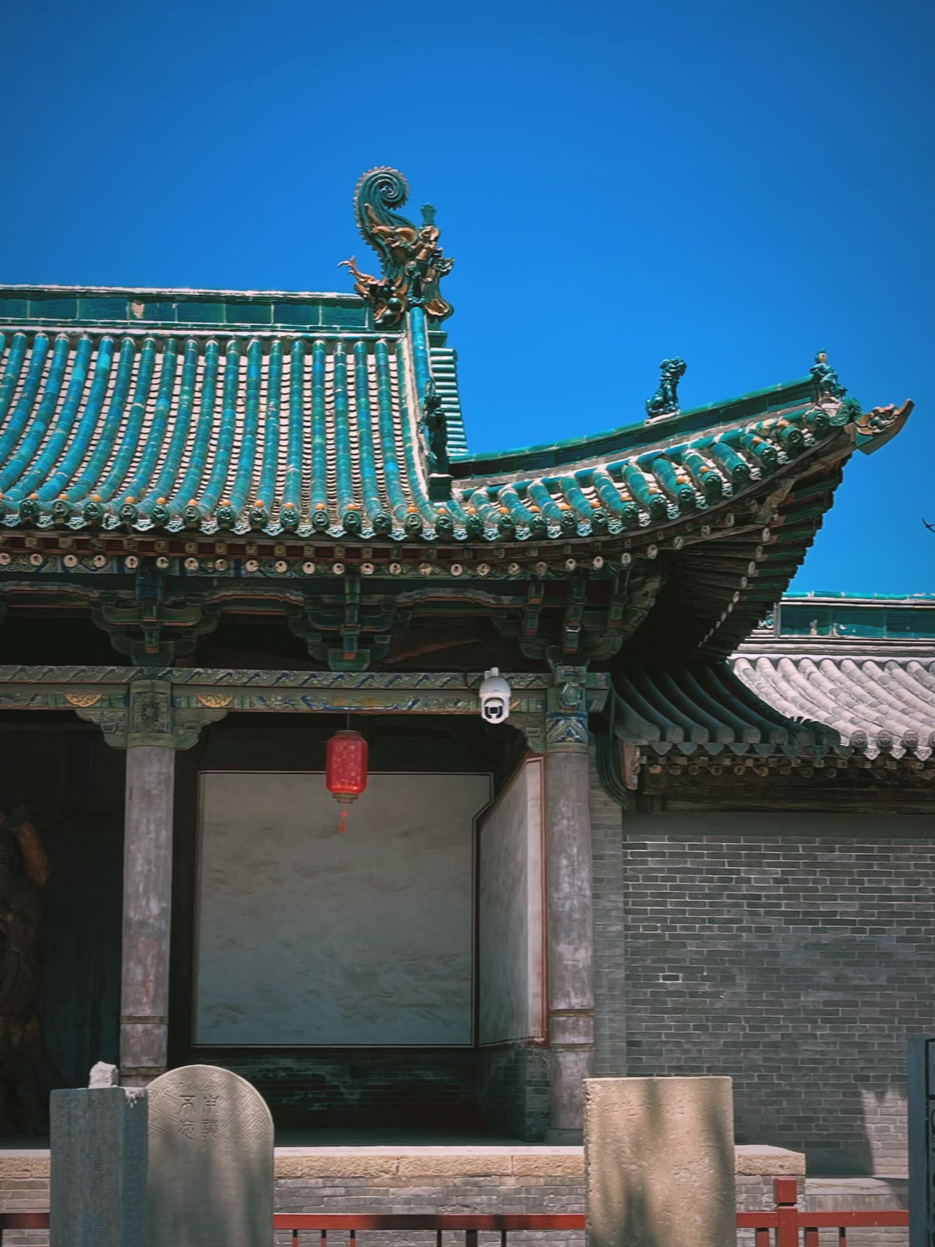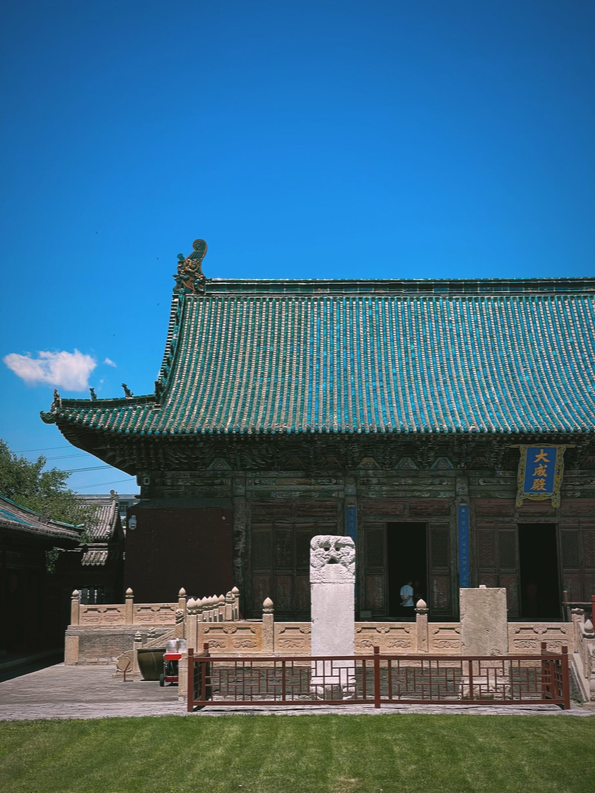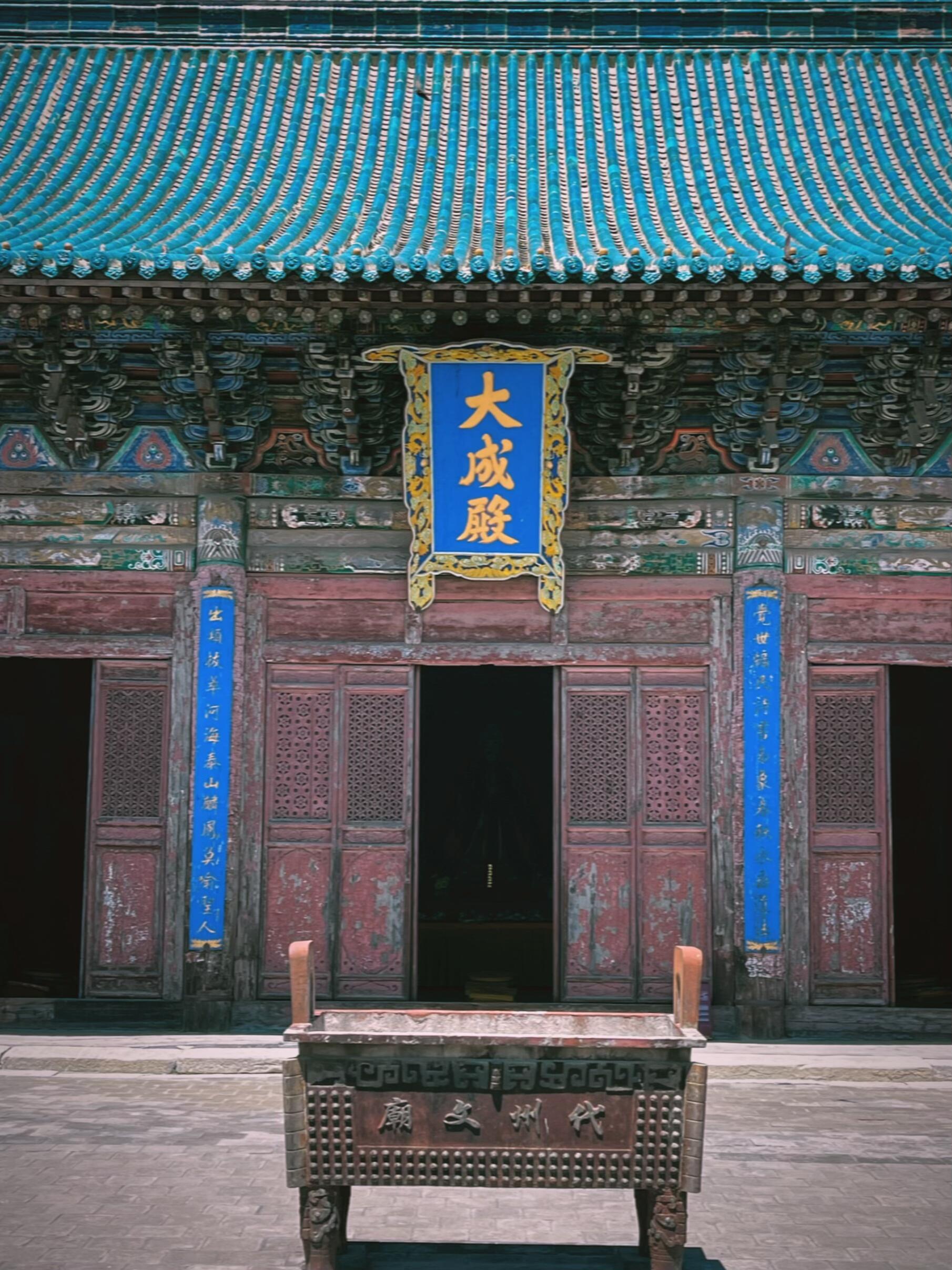 大成殿无疑是代县文庙的灵魂所在,这座主殿建于一米高的台基之上,仅凭地势便带出几分俯瞰众生的威仪。面宽七间、进深八椽的规制,在县级文庙中实属罕见,单檐歇山顶的曲线柔和流畅,却又在脊兽的点缀下不失刚劲。最夺目的莫过于屋顶的孔雀蓝琉璃瓦,这种在北方古建中并不多见的釉色,如同被天空浸染过一般,在晴空下绽放出耀眼的光芒,远观如一片悬浮的碧蓝湖泊,近看则能发现每片瓦当的边缘都带着细微的手工痕迹,那是岁月与匠心共同刻下的印记。