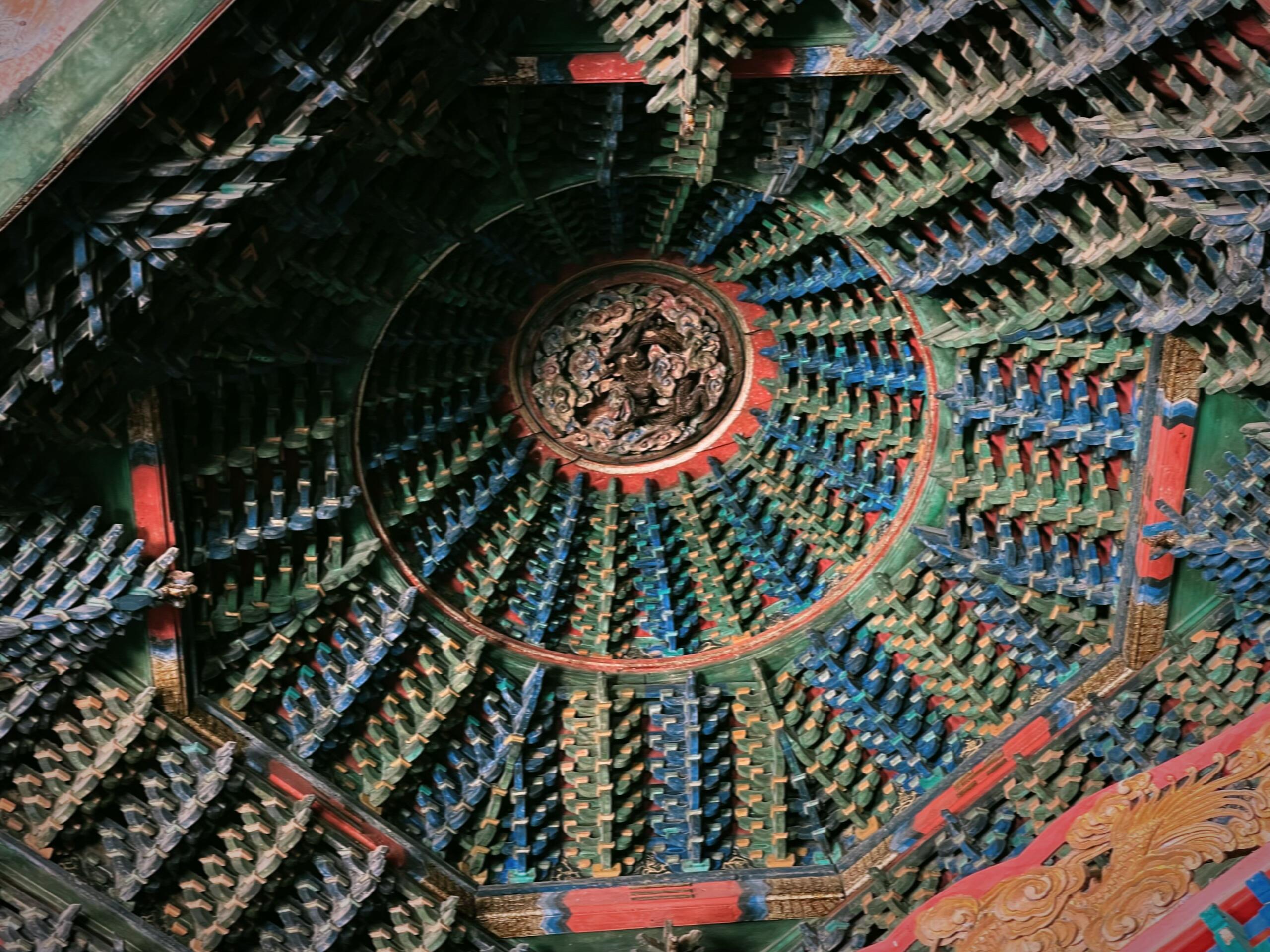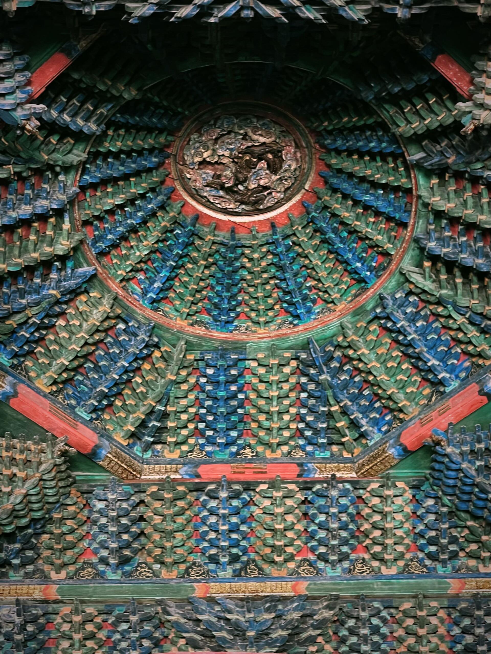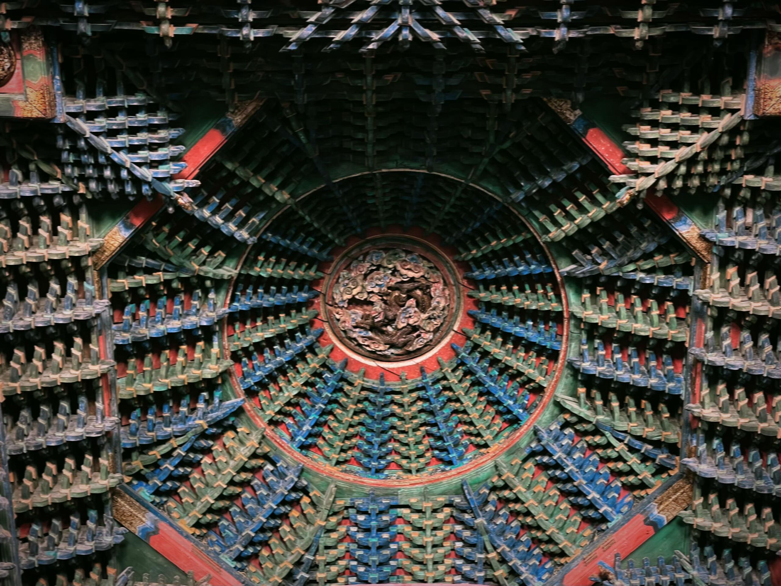 檐下的斗拱更是精妙绝伦,九踩单翘三下昂重拱造的复杂结构,层层叠叠如同展开的书卷,每一个构件都严丝合缝,既承担着承重的功能,又构成了极具韵律感的视觉奇观。抬手触摸斗拱的边缘,木质的凉意在指尖蔓延,那些被岁月磨平的棱角,仿佛在诉说着无数次风雨的洗礼与四季的轮回。步入殿内,瞬间被头顶的龙天花板布顶震撼,数十条金龙或盘旋、或腾跃,色彩鲜艳如初,仿佛刚被画师点染完毕。而殿中央的八卦藻井,更是将整座建筑的艺术水准推向了巅峰。不同于常见的圆形藻井,这座八卦藻井以八卦图形为基础,层层嵌套,色彩浓烈却不失和谐,红、蓝、黄、绿等色彩在穹顶交织,既透着道家的玄妙,又藏着儒家的规整。在山西众多古建藻井中,它独树一帜,没有繁复的雕饰,却以简洁而奇特的样式,让人忍不住驻足沉思:当年的设计者究竟是怀着怎样的心境,将八卦的宇宙观与文庙的文脉传承融合得如此天衣无缝?