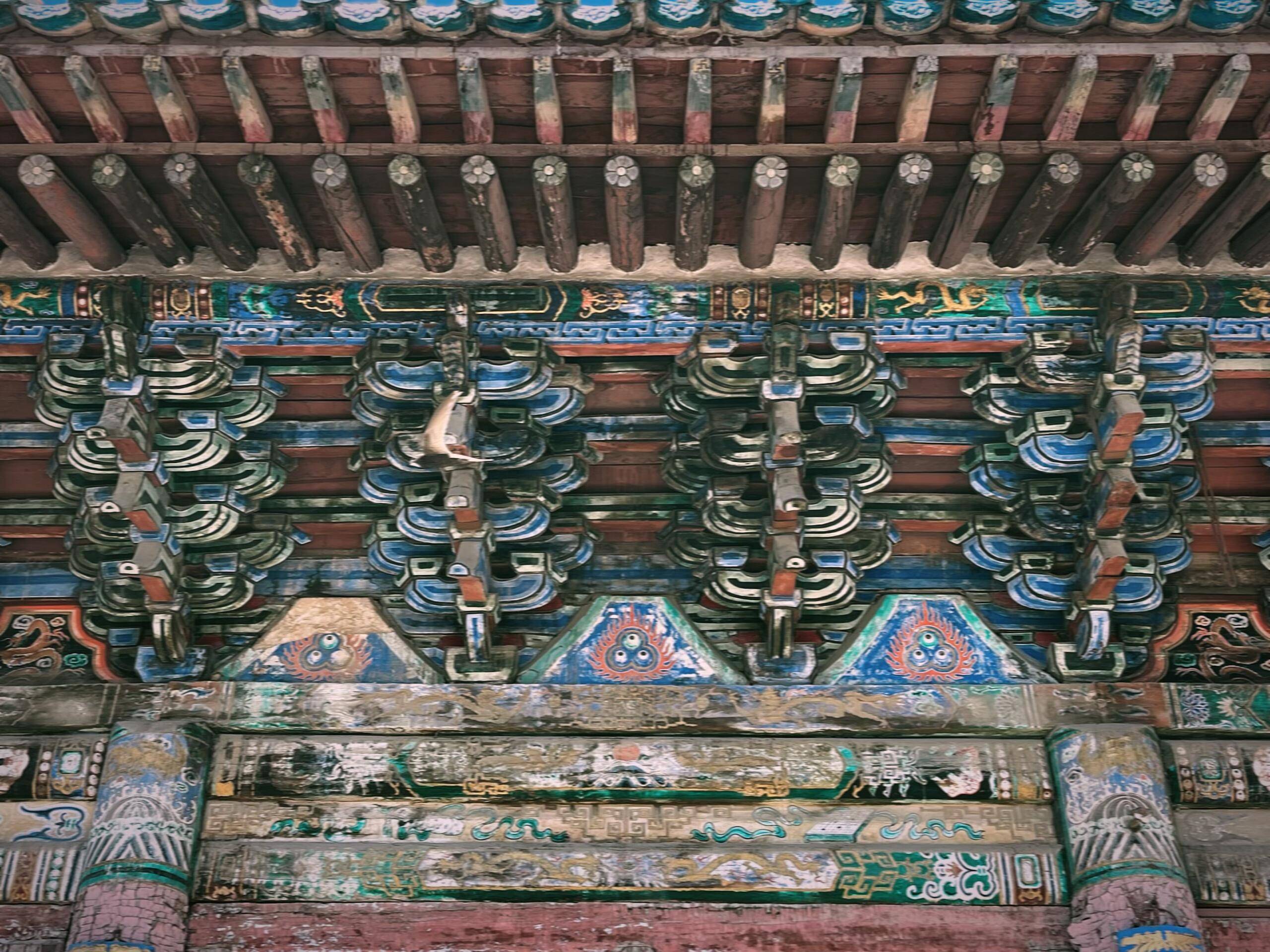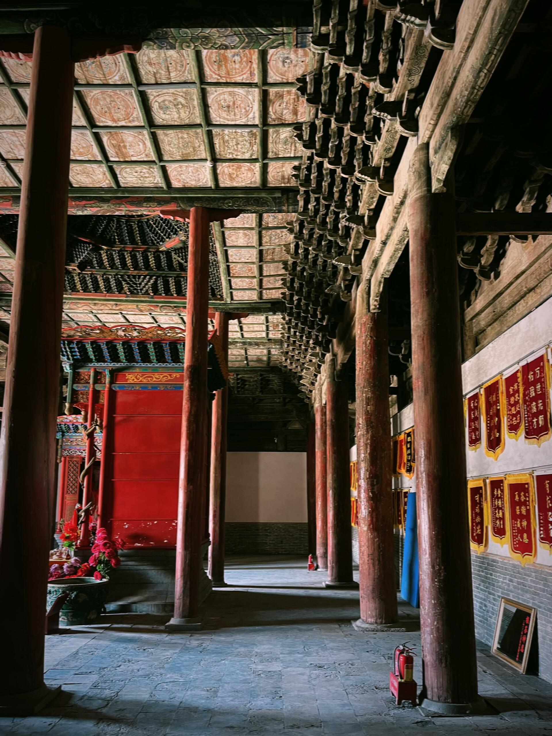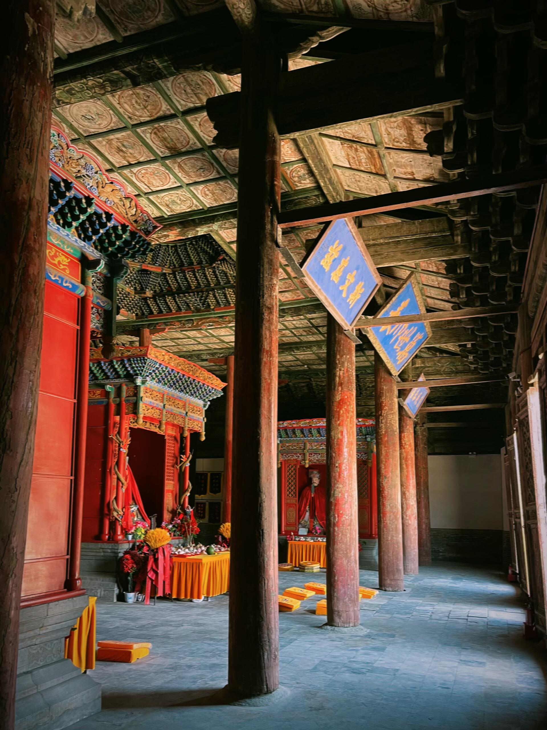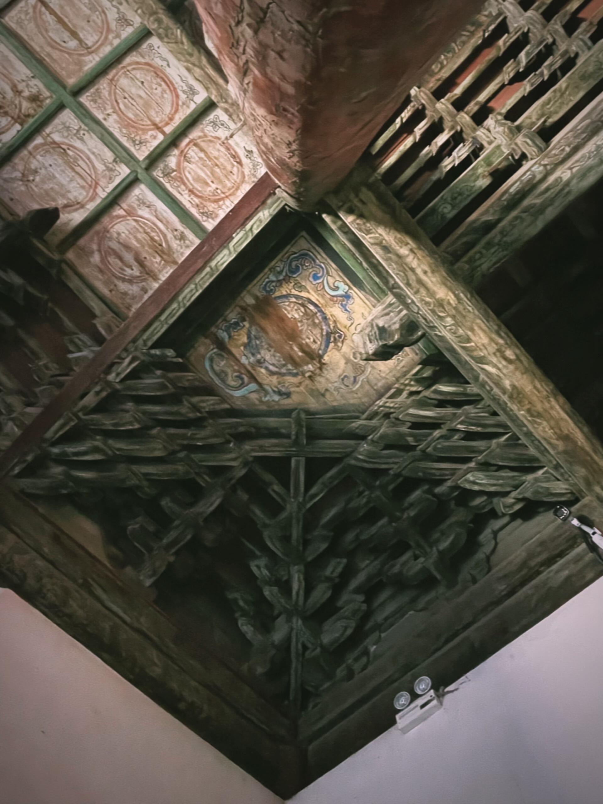 檐下的斗拱更是精妙绝伦,九踩单翘三下昂重拱造的复杂结构,层层叠叠如同展开的书卷,每一个构件都严丝合缝,既承担着承重的功能,又构成了极具韵律感的视觉奇观。抬手触摸斗拱的边缘,木质的凉意在指尖蔓延,那些被岁月磨平的棱角,仿佛在诉说着无数次风雨的洗礼与四季的轮回。步入殿内,瞬间被头顶的龙天花板布顶震撼,数十条金龙或盘旋、或腾跃,色彩鲜艳如初,仿佛刚被画师点染完毕。而殿中央的八卦藻井,更是将整座建筑的艺术水准推向了巅峰。不同于常见的圆形藻井,这座八卦藻井以八卦图形为基础,层层嵌套,色彩浓烈却不失和谐,红、蓝、黄、绿等色彩在穹顶交织,既透着道家的玄妙,又藏着儒家的规整。在山西众多古建藻井中,它独树一帜,没有繁复的雕饰,却以简洁而奇特的样式,让人忍不住驻足沉思:当年的设计者究竟是怀着怎样的心境,将八卦的宇宙观与文庙的文脉传承融合得如此天衣无缝?