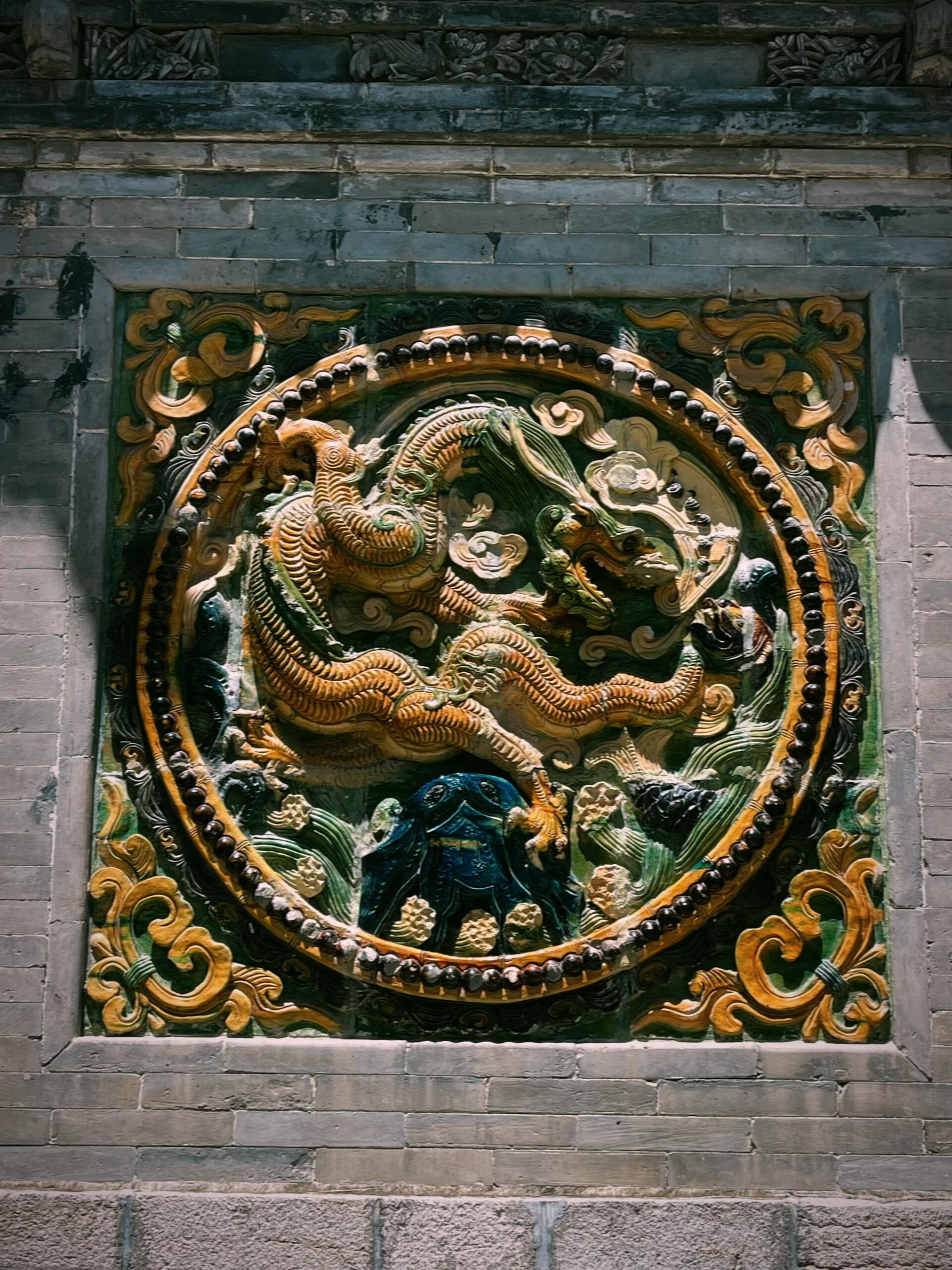 站在文庙门前,最先闯入视野的便是万仞坊与棂星门。万仞坊四柱三楼的形制大气磅礴,木质架构历经风雨侵蚀,仍稳稳撑起一片天空,斗拱层层叠叠,如同文人墨客笔下的排比句式,规整中透着灵动。与之相连的棂星门更为精巧,六柱五楼的设计让整座门坊显得巍峨又不失细腻,最令人惊叹的是夹墙正中的琉璃团龙。那龙并非寻常古建中常见的温顺模样,而是张牙舞爪、气势汹汹,青蓝黄绿的釉色在阳光下流淌,艳而不俗,仿佛下一秒便要挣脱墙体的束缚,腾云驾雾而去。这种奔放的造型与琉璃特有的艳丽色彩碰撞,打破了文庙惯有的肃穆沉闷,让人不禁猜想,当年的建造者是否想通过这样的设计,暗喻文脉传承亦需有龙的刚健与魄力。