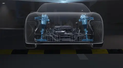 此外,该设计还结合了前虚拟主销双叉臂和后多连杆式独立悬架,并搭载了空气悬架、CDC以及液压衬套。该魔毯悬架系统具备预先扫描路面信息的能力,并能在毫秒级内调整CDC阻尼。当车辆经过减速带时,冲击感显著降低,而在离开减速带后,CDC阻尼会再次进行调整,以控制轮胎的多余反弹。这种设计能够缓解过减速带时的悬挂冲击,从而增强车辆的整体舒适度。该设备能确保在脉冲路面上行驶时不会颠簸,即使在起伏的路面上也不会出现晕车现象。